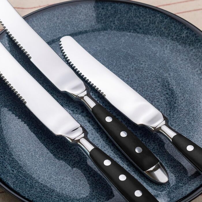 Каждый нож выполнен из высококачественной нержавеющей стали с зубчатыми лезвиями, которые легко и точно справляются с нарезкой мяса, обеспечивая комфорт во время еды. Кованая конструкция придает приборам необходимую тяжесть и баланс — ножи удобно лежат в руке и дарят приятные ощущения при использовании.