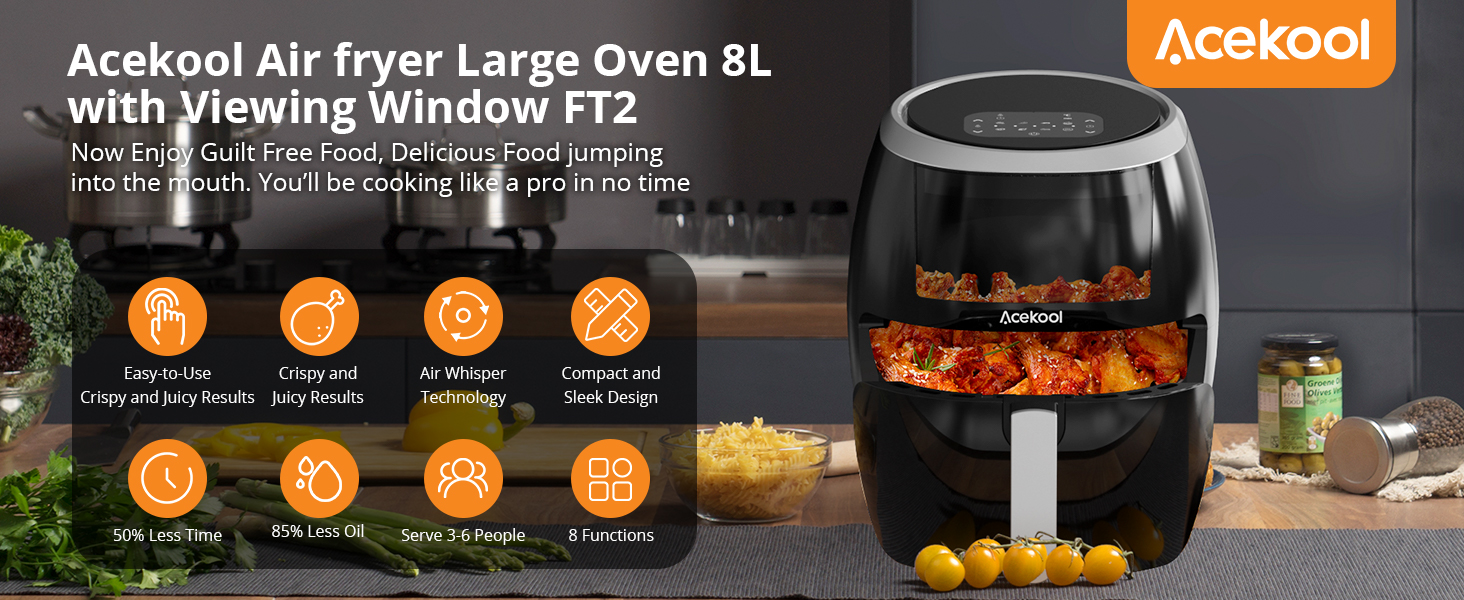 - С низким содержанием масла, более здоровй образ жизниНовая фритюрница Acekool обладает ароматами духовки и универсальностью фритюрниц, при том обем масла уменьшается на 80. то приносит радость от использования различнх ингредиентов с помощью более здоровх методов приготовления, которе позволяют приготовить стейк, отбивне, креветки, рбу, пиццу, бекон, жаренй картофель, овощи и т. Д. Функцию обезвоживания можно использовать для таких продуктов, как фрукт или вяленое мясо. Комбинация тостера, духовки и фритюрниц