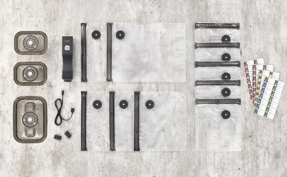 - Множество дополнений: В дополнение к ручному вакуумному упаковщику и набору стекляннх вакуумнх контейнеров, в комплект поставки также входят другие аксессуар: 10 пакетов с застежкой-молнией (5 штук 20x23 см, 3 штуки 26x23 см, 2 штуки 26x35 см), 2 шкафчика на молнии, заряднй кабель USB-C и 4 листа наклеек CASO Food Manager.
