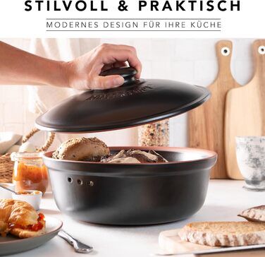 Хлебница Römertopf 30 см в чёрном цвете — это стильное и практичное решение для хранения хлеба и выпечки. Изготовленная из высококачественной натуральной керамики, она обеспечивает оптимальные условия для длительного сохранения свежести: неглазурованная внутренняя сторона крышки впитывает излишнюю влагу, а вентиляционные отверстия способствуют естественной циркуляции воздуха, предотвращая появление плесени и размягчение корки. Вместительная форма подходит для хранения больших буханок или нескольких видов выпечки. Современный чёрный дизайн делает её не только функциональным, но и эстетичным элементом любой кухни. Подходит для мытья в посудомоечной машине.