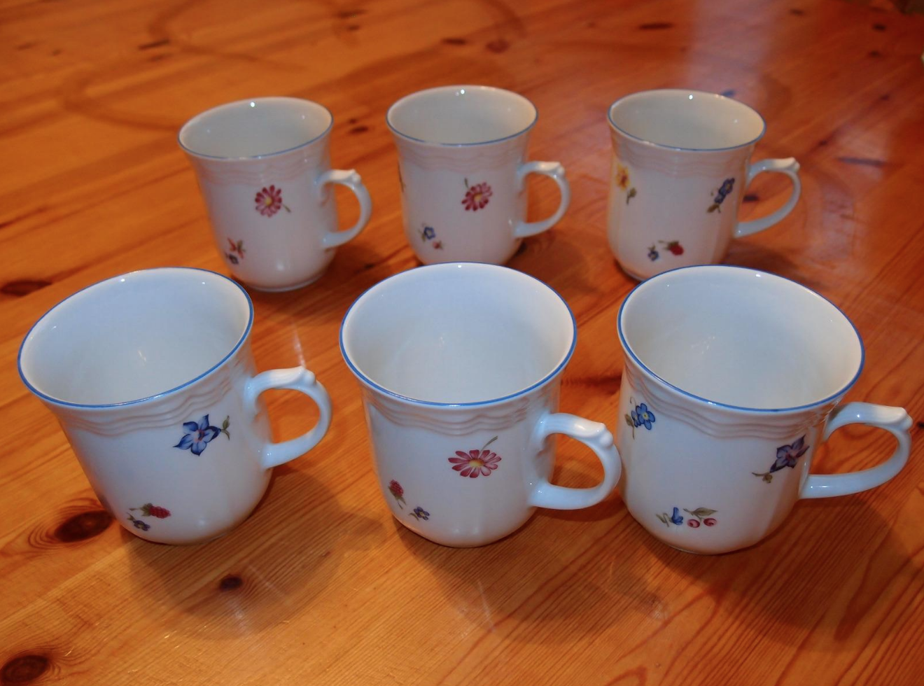 Кружка имеет классические, изогнутые формы дизайна и мелкие, частично волнообразные рельефы. Декор выполнен в виде мелких синих цветков на белом фарфоре.